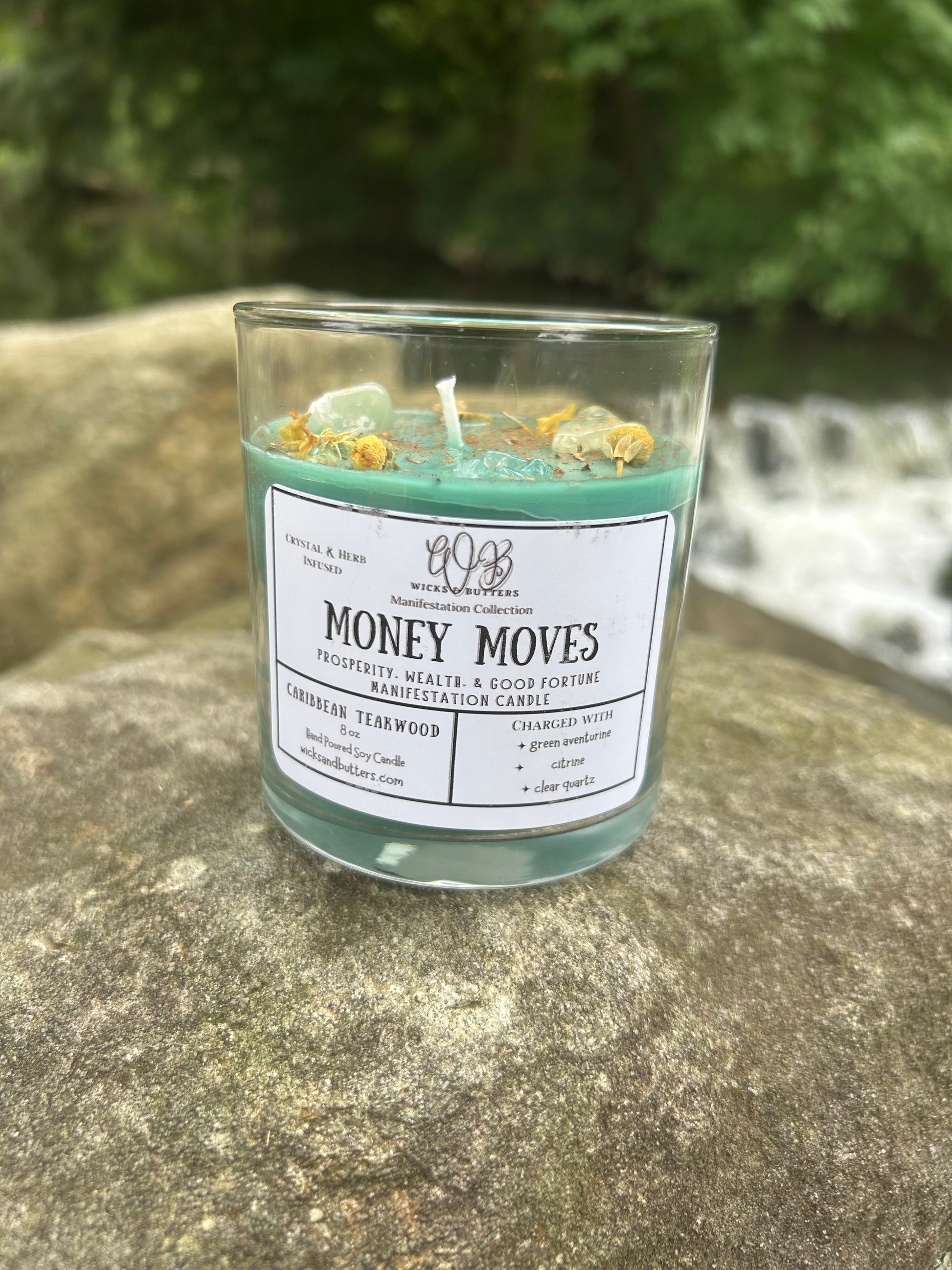 The “Money Moves” candle is bold, magnetic, and perfect for abundance energy — the crystal trio of Green Aventurine, Citrine, and Clear Quartz is on point for manifesting prosperity, confidence, and clear intention.